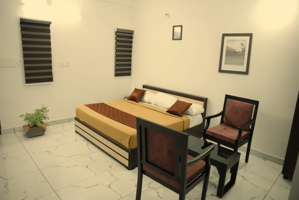 The Premium Room in Kakkanad is designed for guests who value extra space, modern comfort, and a touch of elegance. Perfect for families, small groups, and long-stay travelers, this room offers a welcoming atmosphere that feels both stylish and homely. With its contemporary interiors and premium furnishings, the room creates an ideal setting for relaxation after a busy day in the city or at Infopark and Rajagiri.